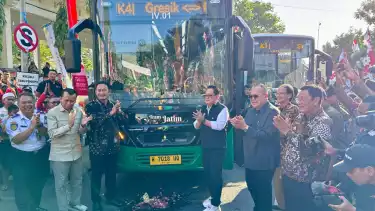 Lamongan, tvOnenews.com - Penjabat (Pj) Gubernur Jawa Timur Adhy Karyono melaunching Bus Trans Jatim Koridor IV rute Terminal Bunder Gresik-Pelabuhan Paciran Lamongan dan pengoperasian Trans Jatim Luxury jelang HUT RI ke-79 tahun di Alun-alun Kabupaten Lamongan pada Jumat (9/8).