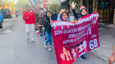 Surabaya, tvOnenews.com - Kemeriahan HUT RI ke-79 terlihat di Sekolah Adiwiyata, SDN Dukuh Menanggal I/424 Surabaya. Rangkaian acara terkemas dalam Gebyar Kemerdekaan, salah satunya adalah Pawai Gebyar Kemerdekaan, yang diikuti oleh seluruh siswa dan dewan guru.