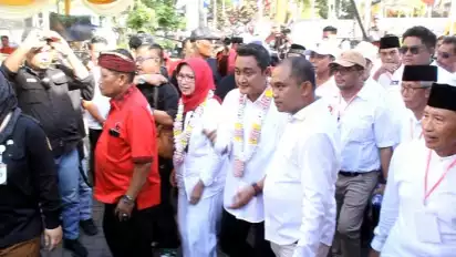 Pantauan tvOnenews.com di lokasi, nampak ribuan pendukung sudah memadati sepanjang Jalan HOS Cokroaminoto hingga Jalan Veteran, dengan membawa berbagai bendera partai pengusung dan pendukung. Nampak pula, beberapa simpatisan ibu-ibu rumah tangga yang ikut meramaikan suasana dengan memainkan musik patrol.