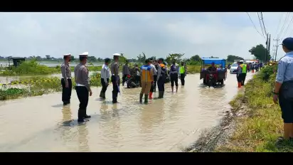 Lamongan, Jawa Timur - Jalan poros yang menghubungkan Kecamatan Sukodadi menuju Kecamatan Kalitengah dan Karanggeneng, tepatnya di Desa Pucangkro, Kecamatan Kalitengah, terendam banjir sepanjang satu setengah kilo meter.