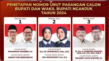 Nganjuk, tvOnenews.com - Komisi Pemilihan Umum (KPU) Kabupaten Nganjuk resmi menetapkan nomor urut pasangan calon (paslon) Bupati dan Wakil Bupati dalam Pemilihan Kepala Daerah (Pilkada) 2024 pada Senin (23/9/2024). Dalam acara yang digelar di halaman KPU Nganjuk tersebut, para pasangan calon tampak antusias saat menerima nomor urut yang akan digunakan sepanjang masa kampanye.