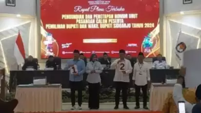 Sidoarjo, tvOnenews.com - Komisi Pemilihan Umum (KPU) Kabupaten Sidoarjo menggelar rapat pleno terbuka pada Senin (23/9) untuk menetapkan nomor urut bagi pasangan calon bupati dan wakil bupati yang akan berlaga dalam Pilkada Sidoarjo 2024. Acara yang berlangsung di Kantor KPU Sidoarjo ini dihadiri langsung oleh kedua pasangan calon, yakni Subandi-Mimik Idayana serta Achmad Amir Aslichin (Mas Iin)–Edi Widodo, beserta tim pemenangan dan kader partai pendukung masing-masing.