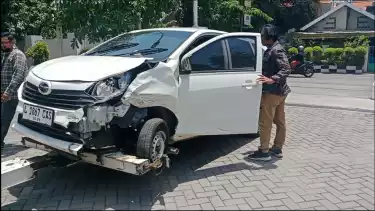 Kondisi mobil milik korban driver online bernama Pujiono ini ringsek bagian depannya, usai menabrak mobil warga di Gunung Anyar Mas Surabaya. Mobil ini dirampas ML gadis asal Ende Nusa Tenggara Timur, dari driver di kawasan Perumahan Gunung Anyar Mas.