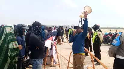 Dalam aksinya massa pendemo yang tinggal di kawasan ring satu KEK JIIPE Manyar itu tampak berorasi bergantian sembari membentangkan spanduk bertuliskan ''Buat apa dibangun pabrik pengolah emas, kalo kita tetap susah beli beras!''.