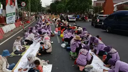 Mojokerto, tvOnenews.com - Ribuan orang mewarnai batik di Jalan Hayam Wuruk, Kecamatan Magersari, Kota Mojokerto, Selasa (15/10/2024). Aksi mewarnai batik ini memecahkan rekor Musium Rekor Indonesia (MURI) mewarnai batik terpanjang dengan peserta terbanyak.