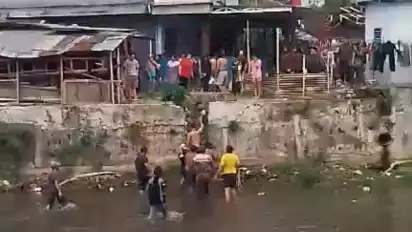 Warga sekitar langsung menaikkan korban dari dasar sungai ketepian untuk menyelamatkan nyawanya.