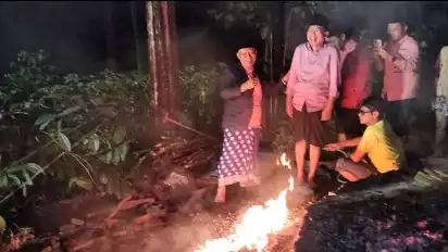 Mereka melakukan atraksi berjalan di atas bara api dengan penuh percaya diri.