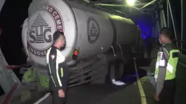 Ngawi, Jawa Timur - Tak kuat menanjak, sebuah truk tangki muatan semen curah seberat 25 ton mundur dan menabrak pagar Jembatan Ngantru Desa Ngawi Purba, Kecamatan Ngawi , Kabupaten Ngawi, pada Rabu (9/2/2022) dini hari.
