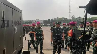 Sidoarjo, tvOnenews.com - Panglima Komando Gabungan Wilayah Pertahanan (Pangkogabwilhan) II Marsdya TNI M. Khairil Lubis, melaksanakan pemeriksaan kesiapan Ratusan Prajurit Pasmar 2 Korps Marinir TNI AL yang tergabung dalam Pasukan Reaksi Cepat Penanggulangan Bencana (PRCPB) di Ksatrian Marinir Sutedi Senaputra, Karangpilang, Surabaya, Jumat (22/11/2024).