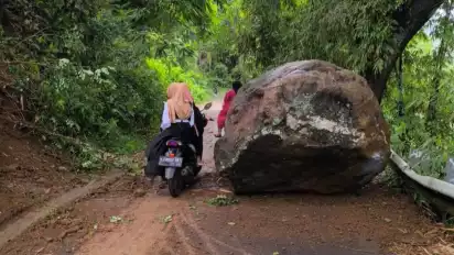 Nganjuk, tvOnenews.com - Aktivitas warga di dua desa di Kecamatan Ngetos, Kabupaten Nganjuk, terganggu akibat longsoran batu besar yang menutup akses jalan utama. Kejadian tersebut terjadi setelah hujan deras mengguyur wilayah tersebut sejak siang hingga sore hari.