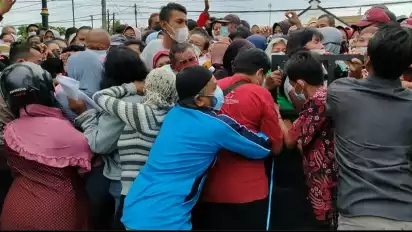 Madiun, Jawa Timur - Ribuan warga di kota Madiun, Selasa (15/2/2022) berdesakan hingga jatuh bangun, demi dua liter minyak goreng bantuan Pemprop Jatim yang dijual murah.