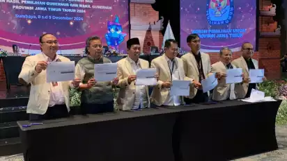 Surabaya, tvOnenews.com - KPU Provinsi Jawa Timur, akhirnya menyelesiakan proses rekapitulasi penghitungan suara pemilihan Gubernur Jawa Timur pada Senin (9/12/2024) malam. Hasilnya, pasangan Khoffiah-Emil meraih suara terbanyak dengan perolehan suara 12.192.165, sementara di urutan kedua pasangan Risma-Gus Hans meraih suara 6.743.095, serta di urutan ketiga pasangan Luluk-Lukman, yang hanya meroah suara 1.797.332.