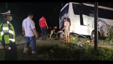 Lamongan, Jawa Timur - Bus yang membawa rombongan peziarah asal Desa Gunungmenyan, Kecamatan Luwihliyang, Kabupaten Bogor, Jawa Barat mengalami kecelakaan di jalur Pantura, Desa Brengkok, Kecamatan Brondong, Kabupaten Lamongan, Selasa malam (15/2/2022). Akibat kecelakaan tersebut, 18 orang peziarah mengalami luka-luka hingga patah tulang.