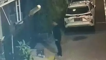 Terlihat korban turun dari mobil dan langsung menyiramkan satu buah botol bensin ke tubuhnya, kemudian korban berjalan menuju depan pagar rumah teman perempuannya itu.