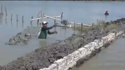 Sidoarjo, tvOnenews.com - Ratusan petani tambak Desa Kalanganyar, Tambak Cemandi, Banjarkemuning dan Segoro Tambak Sedati Sidoarjo, melakukan penguatan dan peninggian tanggul penahan air.