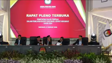 Sidoarjo, tvOnenews.com - Komisi Pemilihan Umum (KPU) Kabupaten Sidoarjo resmi menetapkan pasangan Subandi dan Mimik sebagai Bupati dan Wakil Bupati terpilih periode 2025-2030 pada rapat pleno terbuka yang digelar di kantor KPU Sidoarjo, Kamis (9/1).