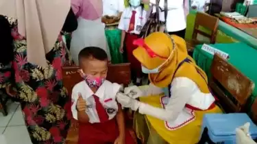 Bangkalan, Jawa Timur - Guna menghilangkan rasa takut siswa saat divaksin Covid-19, petugas kesehatan Kabupaten Bangkalan, Madura menggunakan pakaian serba unik. Langkah itu dilakukan sebagai upaya agar siswa merasa terhibur. Selain itu, petugas juga memberikan kesan supaya mereka tidak merasa takut saat di vaksin.