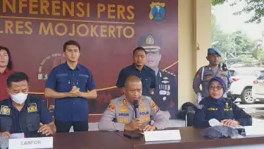 Mojokerto, tvOnenews.com - Polres Mojokerto mengelar konferensi pers terkait ledakan di rumah anggota kepolisian Polsek Dlanggu, Aipda Mahyudi di halaman Polres Mojokerto, Selasa siang (14/1). Dalam konferensi pers, Kapolres Mojokerto dan Latfor Polda Jatim membenarkan ditemukan adanya bahan baku sejenis peledak low explosive di rumah tersebut.