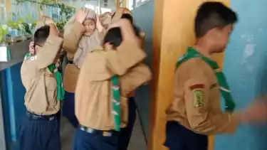 Mereka berhamburan berupaya menyelamatkan diri dari bahaya bencana gempa bumi dengan keluar dari dalam gedung sekolah.