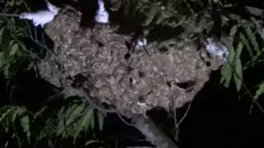 Bangkalan, tvOnenews.com - Petugas pemadam kebakaran Kabupaten Bangkalan, Madura, mengevakuasi sarang tawon vespa berukuran besar di sebuah pohon mahoni, di Jalan Mayjen Sungkono, usai menyerang warga.