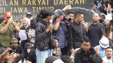 Massa aksi mahasiswa yang tergabung dalam Aliansi Mahasiswa Anti Korupsi (ARAK) menggelar pertunjukan teatrikal di depan Gedung DPRD Jatim. Dalam pertunjukannya, mereka mengkritik pemerintah yang dinilai bertindak otoriter dan sewenang-wenang. Aksi demonstrasi tersebut kembali diadakan sebagai respons terhadap kebijakan yang merugikan rakyat dan melemahkan demokrasi.