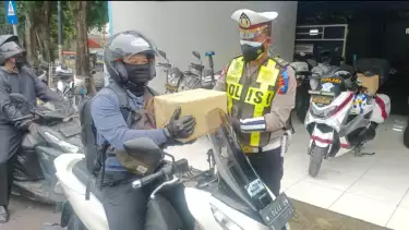 "Kami memberi paket sembako minyak goreng, gula dan mie instan pada pengendara ang tertib berlalu lintas dan safety riding seperti menggunakan jaket, sarung tangan, helm SNI, bersepatu, bermasker, kendaraan lengkap spion, lampu menyala, dan surat lengkap," tegasnya.
