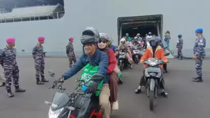 Surabaya, tvOnenews.com - 315 pemudik yang berangkat dari Jakarta dan Semarang menggunakan Kapal Perang Republik Indonesia (KRI) Banjarmasin-592 tiba di Dermaga Ujung Koarmada II, Surabaya, pada Sabtu (29/3). Program mudik gratis ini merupakan bagian dari komitmen TNI AL dalam mendukung pemerintah menjelang libur Hari Raya Idul Fitri.