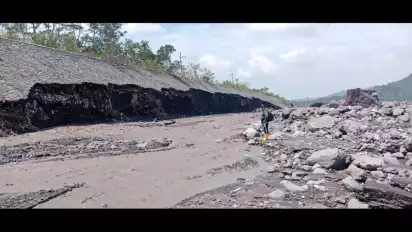 Ruas tanggul penahan banjir lahar sepanjang 2 kilometer ini jebol usai diterjang banjir lahar hujan selama 2 hari berturut-turut yakni pada Rabu (9/4) dan Kamis (10/4).