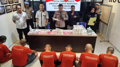 Ponorogo, tvOnenews.com - Peredaran narkotika di Ponorogo, Jawa Timur, makin mengkhawatirkan. Satnarkoba Polres Ponorogo berhasil mengungkap perederan belasan gram sabu dan ribuan pil koplo. Selain itu, tujuh orang juga diamankan dan kini berstatus tersangka.