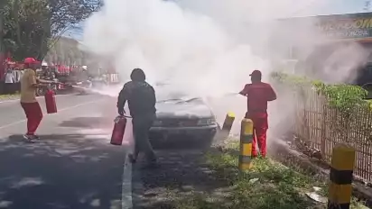 Banyuwangi, tvOnenews.com – Diduga karena korsleting listrik, sebuah mobil sedan Suzuki Baleno terbakar saat melintas di Jalan Raya Cluring, tepatnya di depan SMPN 1 Cluring, Rabu (30/04).