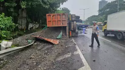 Sidoarjo, tvOnenews.com - Sebuah kendaraan truk tronton bermuatan batubara dari Gresik tujuan Malang terguling di KM 8.200/A Tol Surabaya arah Waru.
