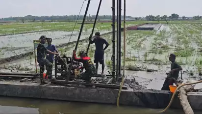 Lamongan, tvOnenews.com- Mengantisipasi terjadinya kekeringan lahan pertanian seluas 15 hektar di Desa Kebalan Kulon, Kecamatan Sekaran, Kabupaten Lamongan, Prajurit TNI 0812 dan sejumlah warga membangun sumur bor.