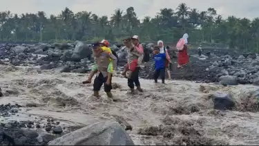 Polisi di Lumajang Sebrangkan Anak Pulang Sekolah Lewati Aliran Lahar Hujan Gunung Semeru