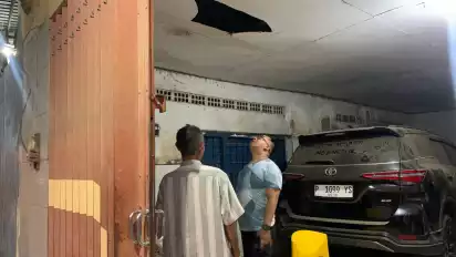 Salah satu sisi plafon toko dalam keadaan jebol. Bocah itu masuk turun ke dalam area toko melalui plafon tersebut.