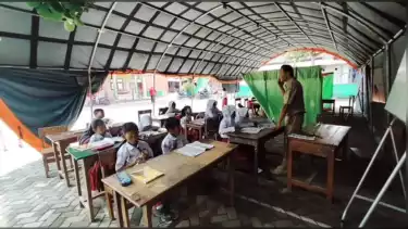 Tenda bantuan dari BPBD didirikan di halaman sekolah sebagai ruang kelas sementara. Namun, kondisi panas saat siang hari dan suara bising dari lingkungan sekitar membuat suasana belajar menjadi kurang kondusif.