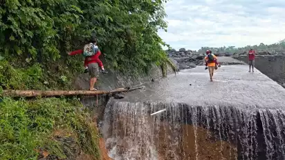 "Orang tua harus mendampingi, bahkan harus menggendong anaknya sampai seberang sungai karena jalurnya masih dipenuhi batu," imbuhnya.