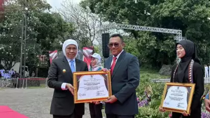 Pasuruan, tvOnenews.com — Dalam rangka memperingati Hari Sumpah Pemuda ke-97 Tingkat Provinsi Jawa Timur, Pemerintah Provinsi Jawa Timur menyelenggarakan upacara bendera di Amphitheater Taman Candra Wilwatikta, Pandaan, Kabupaten Pasuruan, pada Selasa (28/10). Kegiatan tersebut dipimpin langsung oleh Gubernur Jawa Timur Khofifah Indar Parawansa, dan dihadiri jajaran Forkopimda serta perwakilan pemuda dari seluruh kabupaten/kota di Jawa Timur.