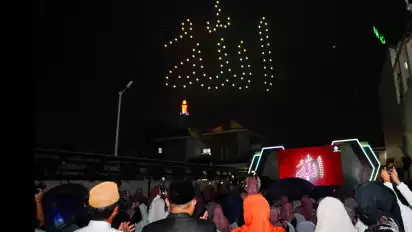 Pertunjukan konfigurasi drone terbanyak yang membentuk simbol "Allah", "Muhammad", dan lainnya yang tampil di udara dalam ketinggian tertentu itu disaksikan oleh Rais Aam PBNU KH Miftakhul Achyar, Gubernur Jatim Hj Khofifah Indar Parawansa dan Sekretaris PWNU Jatim DR HM Faqih. (hen)
