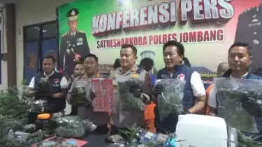 "Sat Resnarkoba Polres Jombang berhasil mengamankan tersangka R warga Nganjuk yang mengontrak rumah di Mojongapit, di rumah tersebut diamankan sebanyak 156 batang pohon ganja dan ganja kering sebanyak 32 gram dan ganja basah 5,16 gram serta ini fermentasi daun ganja yang dicampur dengan alkohol, biji ganja, barang-barang elektronik termasuk tenda dan lampu," terang AKBP Ardi Kurniawan Ka Jombang, Kamis (18/12).