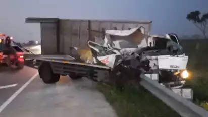 Ngawi, Jawa Timur - Diduga sopir mengantuk sebuah truk boks ekspedisi menabrak tiang beton Jembatan Penyeberangan Orang (JPO) di jalan tol Ngawi tepatnya di kilometer 562, Desa Sidolaju, Kecamatan Widodaren pada Rabu (11/5/2022) pukul 04.00 WIB.