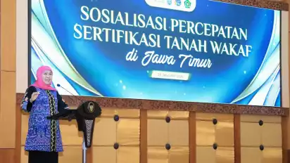 Surabaya, tvOnenews.com – Gubernur Jawa Timur Khofifah Indar Parawansa menegaskan komitmen Pemerintah Provinsi Jawa Timur dalam mempercepat sertifikasi tanah wakaf melalui Sosialisasi Percepatan Sertifikasi Tanah Wakaf di Ruang Hayam Wuruk Kantor Sekretariat Daerah Provinsi Jawa Timur, Surabaya, Jumat (23/1) pagi.