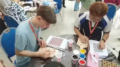 Surabaya, tvOnenews.com - Puluhan mahasiswa asing dari sejumlah negara belajar membatik di sebuah sekolah di Kota Surabaya. Mereka membatik motif kawung karena dinilai tertua di nusantara. Menariknya, para mahasiwa tidak membatik di atas kain, melainkan menggunakan talenan kayu sebagai medianya, dan nantinya dijadikan souvenir untuk dibawa pulang ke nagara asal mereka.