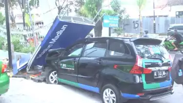 Madiun, Jawa Timur - Diduga hilang kendali, mobil operasional milik BPJS kesehatan kota Madiun, menabrak pemotor dan board pintu masuk Stasiun Madiun, Rabu sore (25/5/2022). Beruntung tak ada korban jiwa dalam musibah ini, namun kedua kendaraan yang terlibat kecelakaan mengalami kerusakan parah.