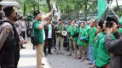 Mereka juga membentangkan spanduk berukuran cukup besar bertuliskan ‘Rabi Karo Wedus Pelecehan Harga Diri Wanita, Tindak Tegas dan Hukum Pelaku Seadil-adilnya'.