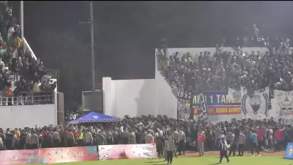 Ribuan orang merangsek masuk ke lapangan untuk mendukung tim kebanggaannya berlaga. Pertandingan yang saat itu memasuki menit ke-33 pun terpaksa dihentikan.