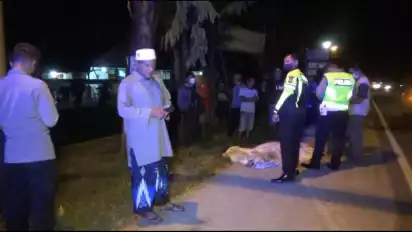 Imbuhnya, sepeda motor korban juga terpental hingga keluar jalan, sementara truk yang menabrak adalah kendaraan pengangkut tebu dari pabrik gula di Genang.