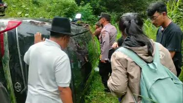 Tiba di lokasi yang jalannya berbelok, mobil warna hitam ini tiba-tiba nyelonong ke jurang. Sebelum jatuh, moncong mobil menghantam pembatas jalan, lalu terjun dan terguling di lembah jurang yang curam. Mobil nyaris masuk ke sungai di dasar jurang.