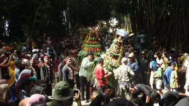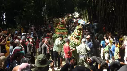 Usai diarak keliling kampung, ke 21 gunungan hasil bumi langsung jadi rebutan ribuan warga, yang sudah tidak sabar lagi menunggu prosesi penanaman kepala sapi berakhir.