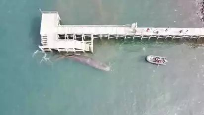 Tubuh ikan paus ini tetap nyangkut di dekat dermaga kayu milik salah satu hotel. Begitu dipastikan tak bernyawa, petugas langsung mengakhiri kegiatan evakuasi. Bangkai paus dibiarkan terapung, hampir sebagian tubuhnya menyembul akibat air laut yang surut.