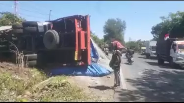 Diduga Rem Blong, Truk Muatan Semen Terguling, 1 Orang Tewas